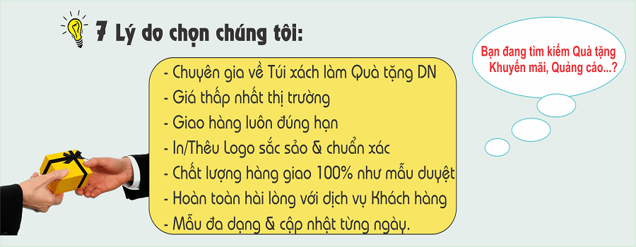 Với uy tín & kinh nghiệm hơn 5 năm hoạt động trong lĩnh vực quà tặng cho cả thị trường nội địa và xuất khẩu, cùng với sự sáng tạo không ngừng trong thiết kế mẫu mã và phong cách làm việc - quản lý chuyên nghiệp, theo hệ thống từ khâu sản xuất đến kinh doanh giúp tiết kiệm được rất nhiều thời gian, ngân sách và công sức cho Khách hàng, chúng tôi đã được nhiều đơn vị trong và ngoài nước tín nhiệm và chọn làm đối tác cung cấp mặt hàng quà tặng mỗi khi có chương trình khuyến mãi, quảng cáo, tung sản phẩm mới, sự kiện thể thao, hội thảo, hội nghị, triển lãm, tri ân khách hàng ...hay đơn giản là đặt vật hữu dụng cho nhân viên thân yêu của mình như: balo laptop, cặp hồ sơ, valy đi công tác...vừa tiện dụng, thể hiện sự quan tâm của bạn đối với nhân viên lại vừa nâng cao phong cách chuyên nghiệp của tổ chức doanh nghiệp thông qua hệ thống nhận diện thương hiệu được in/thêu  sắc sảo ngay trên sản phẩm được tặng.